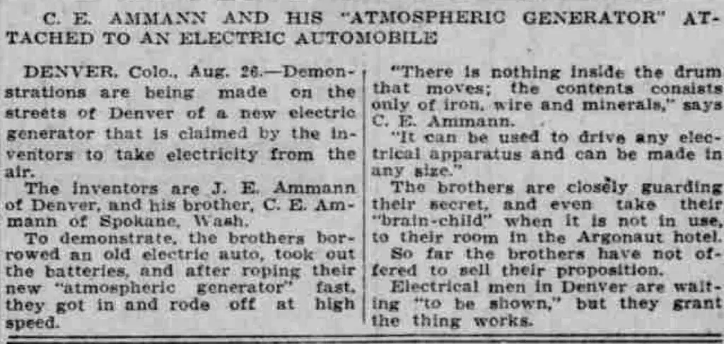 DENVER, Aug. 10.—Has an invention been made that will revolutionize the electrical world? Will the apparatus conceived by a Denver man light buildings, run automobiles, battleships, power plants by the unlimited supply of electricity in the air? Denver electrical experts say "yes", and the young Inventor. C E. Ammann, Monday demonstrated his invention by attaching it to an automobile and running in it about the city. An atmosphere generator is the name of Ammann's apparatus. It is a compact, cylindrical object with two small brass spheres protruding from the top. Inside, Ammann says, is an arrangement of steel wires and minerals, so fixed as to draw electricity from the air. condense it and utilize it for driving power. The automobile which Ammann used for his demonstration Monday was the body and chassis of an electric vehicle. There are said to he no batteries in the car. It propelled it , self with remarkable speed at a touch I of the foot, climbed hills and glided thru a maze of traffic under easy control. When asked by skeptical persons if he had a storage battery concealed inside of the power cylinder. Ammann said: "As badly ns I would like to show the inside of my invention I can't, for I have not yet obtained patent rights. it would he exposing the result of seven years of work to open the cylinder. I leave for Washington this week to obtain the patent rights. When I return I will gladly show everything and I can only say. wait until then and time will tell. "1 have bucked every law of the | textbooks to perfect the invention. It appears on the order of the wireless telephone but it is decidedly different except that the electricity is derived from the air. It will run anywhere except under water. "The automobile is only a simple test. The generator will light buildings, furnish an inexhaustible supply of power for airplanes, do away with steam turbines, and, in fact, propel any kind of an engine." J. N. Davis, proprietor of the Davis Electric Garage Co. at 921 East Fourteenth avenue, and one of the oldest electrical men in Denver, made a thorough study of the generator. “I believe that Mr. Ammann has at last made the invention which will revolutionize power." Mr. Davis said. “Of course, we don't know what is inside of the generator, and the inventor would he foolish to show us. We have long known that certain minerals exist, which, if properly arranged together, would furnish power. That, in substance, according to the blueprints of the invention, is the basis of the whole thing. "If the generator has been perfected to the extent that it will propel an automobile, the rest of its work is assured. It will be the greatest invention of the age. The electricity obtained from the air, first passing thru the generator, would be available for any use." So impressed was Mr. Davis that he offered the use of the building for Mr. Ammann's headquarters. Ammann. who is but 28 years old, came to Denver from Spokane Wash. He is an electrical engineer and lives at the Argonaut hotel.