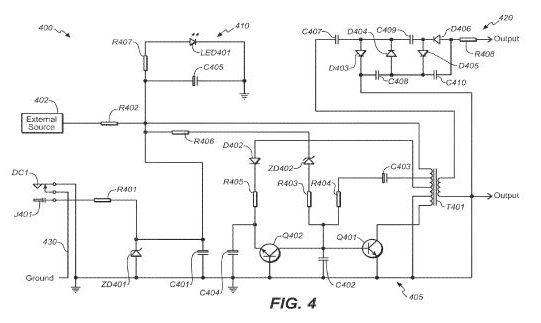 [0046] Pulse oscillator circuit 405 comprises transistors Q401, Q402, diode D402, Zener diode ZD402, resistors R403, R404, R405, and R406, capacitors C402, C403, and C404, and primary transformer T401.
