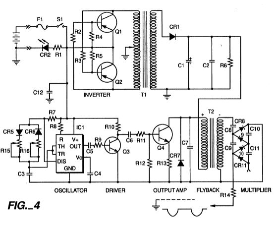 Referring to FIG. 4, an inverter circuit is formed from transistors Q1 and Q2 and associated circuitry (i.e., resistors R2, R3, R4, and R5) to operate as a conventional D.C. to A.C. converter, driving a transformer T1 to convert a D.C. voltage (here, a 12-volt supply provided by an automobile battery) to an A.C. voltage. The A.C. voltage from the secondary of the transformer T1 is converted to a D.C. voltage of approximately 150 volts by the diode CR1 and by capacitors C1 and C2, and is then applied to one terminal of the primary of flyback transformer T2. The other terminal receives a negative-going pulsating signal which is initiated by an integrated circuit oscillator IC1 and is amplified by the transistor circuitry of Q3 and Q4 and associated support elements. The secondary of the flyback transformer T2 is coupled to a multiplier circuit comprising principally the capacitors C8, C9, C10, and C11, interconnected by the diodes CR8, CR9, CR10, and CR11. The output of the multiplier circuit produces the waveform as shown in FIG. 3. The pulse width of the negative-going pulses is selected by adjustment of R15.