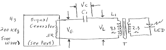 While I did not have the actual circuit elements as used by McClain and Wootan, I felt that this circuit was but a specialized application of a typical series resonant circuit consisting of a capacitance and an inductance having some unavoidable series resistance. I had available an old tube-style signal generator which ranged from 20 Hz to about 200 KHz which could develop only about 4 mW of real power across its 5 KOhms internal output load (at 100 KHz). The unloaded voltage output was about 4.5 volts (AC rms) and they short-circuit rms current was about 0.9 ma. I had plenty of capacitors (including some 'piezo' type ceramics) to test in this circuit. For the transformer, I had some small potted transformers in which the coils were wound on a ferrite core (unmagnetized) having a 1/4" diameter and a length of 3/4". The primary winding appeared to have in the order of 500 turns of about #30 magnet wire, while the secondary may have had 1/5 of this number of turns. The original purpose for these units was unknown, but the units were marked as 5.0 mH and a 5:1 ratio. Since the possible output was expected to be low-level, the load in the output was made an LED device rated at 10 ma at 1.85 volts DC. The test circuit was thus as follows: