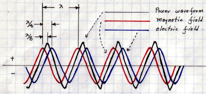 (1) There is a 1/4 Lambda (90°) phase shift between the magnetic and electric components of the wave.(2) The power waveform (Poynting Vector) peaks between the two components.