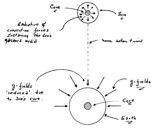 b. The dense core causes a gravitational ‘shadow’ effect which reduces the amount of a g-field flux received by an observer who is in line with the core.