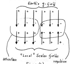 (2) The pure scalar field structure of the universe is not directly "observable" since that structure exists as a "perfectly balanced" structure, with the rhysmonic vectors "canceling" each other’s energies. However, the scalar flux gradients as shown in Figure (2) and Figure (3) are "observable" as scalar interaction with matter when observed with the proper instrumentation. For example, the scalar flux due to the earth’s g-field is simply observed as the presence of "weight" in a given mass, which is accelerated by this scalar flux field. The instrumentation required here is but a simple scale system. However, other interactions may be more subtle and thus require special instrumentation as will be briefly considered in this brief.