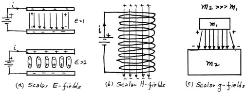 (2) Scalar E-fields are related in some way to the presence of charge as was shown in Figure (3). A somewhat uniform scalar E-field can be generated by charging the plates of a simple parallel plate capacitor as shown in b. The intensity of this field can be made variable, either by varying the voltage across the plates, the spacing between the plates, or the permitivity of the dielectric material between the plates. In essence, the gradient of the potential is due to an excess of rhysmonic density at the (+) end of the gradient as compared to the (-) end of the gradient.