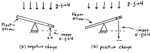 (2) Charge one end of the soda straw negatively by rubbing with dry hands or a cloth. The electric field (E-field) formed by that negative charge and its positive "image" charge will interact with the earth’s g-field (in opposition) and thus the negative end of the straw will be repulsed toward the ground.