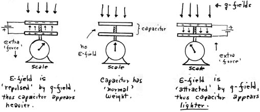 (2) When SW is closed, an E-field as shown is created. This field will sum with the g-field, and the detector will read an increase in g-field, or an apparent increase in the earth’s gravity.