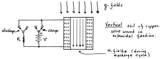 (2) The solenoidal H-field generator shown in Figure (4b) may also be used in detection in that an incoming scalar flux in tis coil may drive a small electron flow (current) in that coil. While interactions with flux between coils have been used ever since the days of Faraday, and especially by Tesla, the interaction of coils with the gravitational flux will be further considered briefly in the section on magnetogravitic effects.