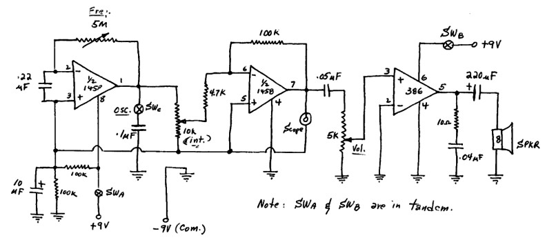 1. Separate 9 volt batteries are used for the detector and power amplifier circuits.