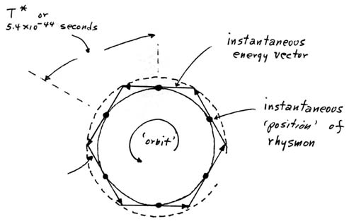 As depicted in Figure 1, the dynamic energy vectors of each individual rhysmon will be directed in all possible directions in the plane of their orbits as a function of each instantaneous time period, but each individual rhysmon will return to its original vector direction after a time period of 6T*. Moreover, in the case of the 3-dimensional configuration of a basic matrix cell structure, as shown in Figure in the Monograph Rhysmonic Cosmology for a particular instant of time, the dynamic energy vectors will be directed over every conceivable possible direction in space during the course of the instantaneous positions of each individual rhysmon in that same time period of 6T*. These impulse forces in space will thus be a function of and related to Planck's Constant, h.