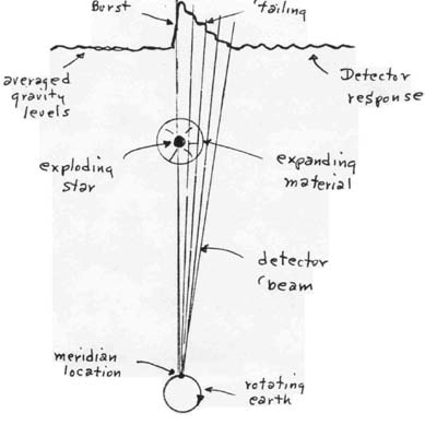 Novae are stars which "explode" and thus eject some of their outer layers and most of their atmosphere. This is a momentary and transitory type of event which must be "caught in the act", so to speak, since they do not ordinarily leave permanent traces which may be "observable" with this system in further scans of that region. The novae generally have two characteristic "signatures" when detected with shadow-type detection systems. These are depicted in Figure (1). As the extremely fine resolution "beam" of the detector scans a nova event (as a function of the rotation of the earth), it will first detect the actual explosion, primarily as a sharp gradient in the earth's gravity field, due to the "modulation" of the earth gravity field by the sudden displacement of a large amount of mass at the nova event. As the "beam" moves with the earth rotation, it will pull away from that expanding mass in the nova event and thus the response will fall off, or tail, as shown in the depiction of Figure (1). In some cases, some shock-wave modulations may appear, if the exploding star was in or near a gassy or dusty environment. Nova events apparently occur quite often and thus are also "seen" quite often with this detection system.