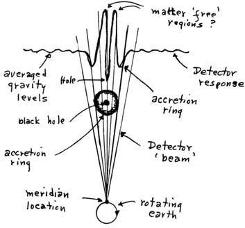A new black hole usually retains an accretion ring structure and the characteristic "signatures" are as depicted in Figure (3). They can be quite pronounced in the first few days following the supernova event. Here, the fine resolution scanning "beam" of the detector can sweep across the entire structure of the black hole and accretion ring as shown in Figure (3). The black holes and accretion rings have very long lifetimes, but the detection system may also pick up black holes without the accretion ring. These may be very old supernovae events which have since "lost" such structures in an in-fall type of mechanism. Our own galaxy Center now has a new and very pronounced "black hole" structure since about December 6, 1986!