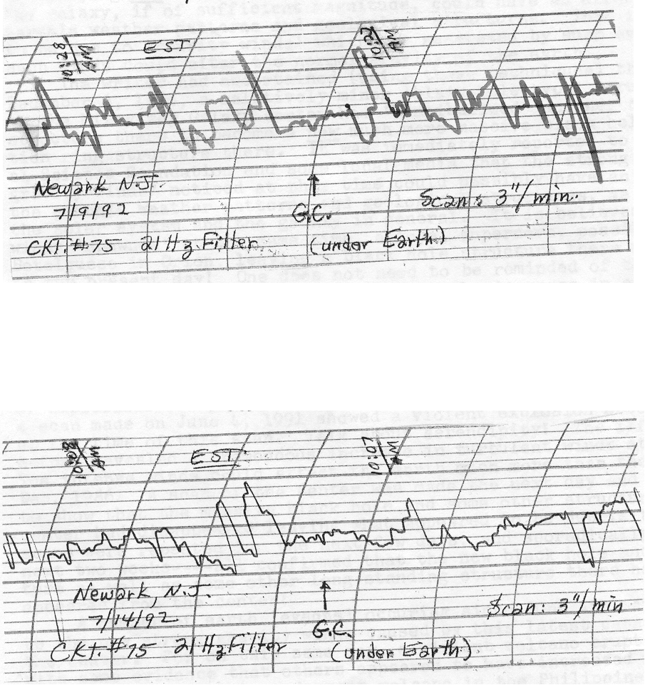 The new black hole and ring structure in the galaxy center has been relatively stable since its creation in December 1986. It was still observed to be stable in a "scan" made on September 11, 1990. However, a scan made on May 16, 1991 had indicated that the center "hole" may have become somewhat unstable, showing evidence of two (possibly three) minor explosions since the last observation of September 11, 1990. Moreover, a scan made on June 4, 1991, showed a violent explosion occurring there at the time of this scan. Talk about serendipity! The l/f noise detectors revealed a tremendous increase in turbulent winds at this time! The intense winds could affect the earth much more than the event of December 1986! A scan of the Center was made the next day and it appeared to show that the massive black hole and some other structures at the center had disappeared leaving what appeared to be debris there. The scans were repeated for the next few days, and sporadically for the next two weeks --- all confirmed that the new black hole and ring structure as well as some other long-standing structure there had really disappeared from the center!