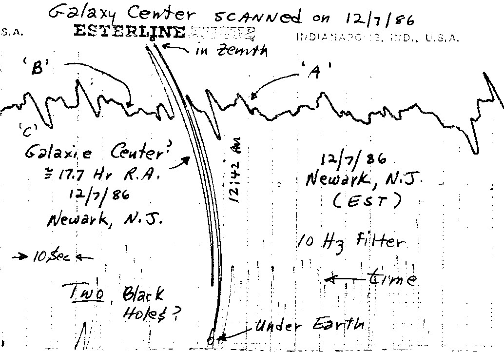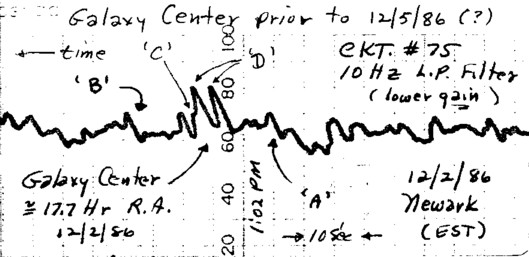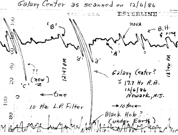 This is how the GC ‘looked’ in GW scans made prior to this date. The GC is in the zenith area in this scan and large masses in the zenith result in a reduced g-field and thus an up-scale reading on the strip chart. The responses A and BB are believed to be a rotating shock-wave wall of material blasted from the GC. The dense masses D may be separate masses, but are more likely a dense ‘accretion ring’ of material, with little mass in the central region. The mass C was noted in previous scans to be slowly moving toward the GC area. The capture of this mass may have precipitated the catastrophic event at the GC which was noted on 12-6-86 and thereafter.