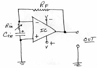 Rin: 1 k ohm subminiature trimpotUse of a small resistance for the input detection device is also effective as a GW detection unit as was shown in Figure 6 of the R-E Electronic Experimenter Handbook article of January 1989. However, signals generated by a capacitative and a resistive detection unit are 180° out-of-phase in the output. Thus, any scalar-type signal developed in the output will also be 180° out-of-phase with the strong GW signal developed by the main input capacitance and thus the system will tend to "degenerate" rather than "regenerate" at the high input levels and thus not go into instabilities or oscillations. There would not be any loss of conversion gain in this process.