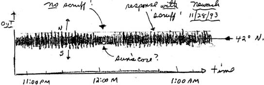 A. The lunar eclipse of 11-28-93 was visible here at Newark NJ from about 11:40 pm to about 2:50 am, with totality occurring from about 1:02 am to 1:50 am. Since our GW detectors ‘look’ at but a small N-S segment of our zenith with the rotation of the earth, then at about 12:00 midnight we would be seeing only a small portion of a partial eclipse in terms of gravitational effects. There would not be much change in the earth’s g-field since the moon and sun would be at opposite sides of our position on earth and these gravity effects would largely be nullified. However, past experience has shown that ‘near’ masses such as the earth, moon and sun would have a ‘filtering’ effect on GW signal responses, i.e., they tend to ‘smooth out’ some of the fluctuations seen in the GW responses. Thus, a scan was made during this eclipse with the hope of at least ‘seeing’ this smoothing effect.