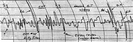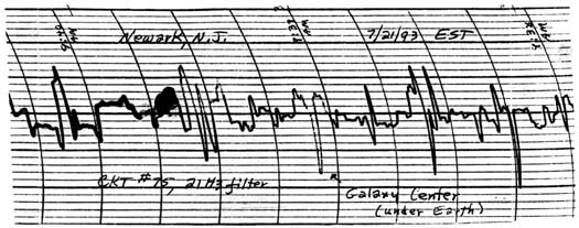 (a) Note: This scan was made under the same conditions as that shown in Figure (2) Note of 7-19-1993. The dense mass now collecting at the Galaxy Center again still does not appear to qualify as a 'black hole' yet. The pen of the recorder was drying out -- an attempt to refill it resulted in the 'blotting' seen above. Also note the corrected time in this scan; the time on 7-19-1993 was corrected for EST in the wrong direction!