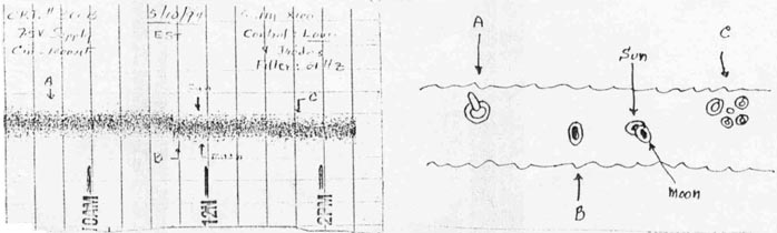 A two-dimensional scan (2D) of the zenith-nadir area was made during the time of the 5-10-94 solar eclipse of the sun by the moon. Circuit # 300B was used with 21 Hz LP filtering and a 4-diode offset to drive the Rustrak 288 chart recorder. The output level was kept low to limit the scan width to about 1/4 inch only. The scan period was unattended and shut off when I returned home about 3:30 PM EDT. The results are given below, the actual scan and an enlarged portrayal of what could be seen in the scan, since it is difficult to reproduce by a copier the details in the original.