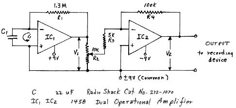 Original tests used a large capacitor (15,000 uF for C1, thus a large input time constant (the intrinsic input impedance of IC1 is in the order of 3.2 k ohms) necessitated use of a zero-center voltmeter for the recording device. Test results were dramatic, but it was later ascertained that Doppler effects introduced by the presence of a strong local FM radio station were masking the results. When the input capacitor was reduced to 10 uF, perturbation effects now "rang" the circuit at about 45 cps with a decay time of 1-2 seconds. The recording device in this case was a low noise audio amplifier. However, it was observed that a low-level background pulsating ringing persisted even though perturbation tests were halted. First impressions were that the background ringing was due to neighborhood arcings, as appliances were turned on and off, since the circuit was also extremely sensitive to short electromagnetic pulse effects. Reduction of C1 to 1 uF not only increased the natural frequency of the rings, but also increased the intensity and the number of bursts being detected. It was ascertained at this time that the source of the detected signals was very much external to the environment.