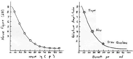 Another concept in the author’s cosmology inferred that gravitational collapse, such as supernova, should create a new kind of gravitational wave front (not the same as predicted in General Relativity) which would appear to the detector dielectric element as equivalent to an alternating electric field. According to current supernova theory (Ref. 4), this gravitational pulse should be Gaussian in amplitude, have a frequency in the order of 1 kc, and have burst periods in the order of 3-100 milliseconds. These bursts, according to the author’s cosmology, would also reach any portion of the universe in about 10-44 seconds, i.e., the pulses would be received in real time. Using an approximation of about one supernova per galaxy per 300 years, and about 90-100 billion galaxies in the universe, it was estimated that 10-15 bursts per second from supernova effects was reasonable. To optimize the detection of such bursts, the input capacitor was reduced to 0.22 uF in order to ring the circuit at about 500 cps for a broad resonance with such effects. It was now possible to ring the circuit with the perturbation mass of a pin point as shown in Figure (1a). The entire circuitry was double-shielded in an aluminum box within another steel box to eliminate electromagnetic fields from affecting the detector. Strong burst-type pulses continued to be detected, even when additionally shielded within another steel cabinet. These pulses have been continually observed by the author ever since the first experiments in 1975. many detectors have been built by the author, some by select colleagues, and all detectors performed similarly. In multiple detector tests, coincidence of bursts was noted. The observed bursts are Gaussian in amplitude and are in the order of 3-100 milliseconds long. A typical single sweep of bursts as seen on an oscilloscope is shown in Figure (3). The burst amplitudes are an inverse function of the frequency of the bursts, i.e., the greater the amplitude, the lower the frequency of such bursts. Relative amplitude and frequency of detected bursts is plotted in Figure (4a). The typical response of l/f noise in transistors (Ref. 5) is ploted in Figure (4b) for comparison. The similarity in plots is quite evident.