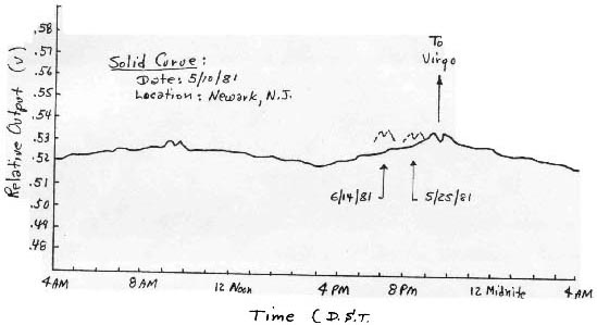 The response of the detector as averaged by a digital voltmeter at output, V2, is shown in Figure (5). This rough plot was made over a 24-hour period on May 10, 1981. For one earth revolution, the response is seen to be slightly anisotropic. Even with averaging, structure is seen in this plot, although only the major variations are shown. The peaks and dip recorded at 9:30 pm was roughly correlated with the autumn equinox at 12h right ascension, located in the Virgo region near the zenith at this time. This structure in the detector response moved about 4 minutes earlier each day and was followed for several weeks, and thus appears to confirm the observation that the burst response of the detector was related to our location on earth with respect to the rest of the universe. A tentative explanation for this response, in terms of the author’s cosmology, was made that (1), the universe is finite and spherical in shape, (2), the universe has a hard-core center of galaxies, and (3), the earth is located appreciably off-center in this scheme. The response also suggests an alternate explanation for the microwave background radiation detected by Penzias and Wilson.