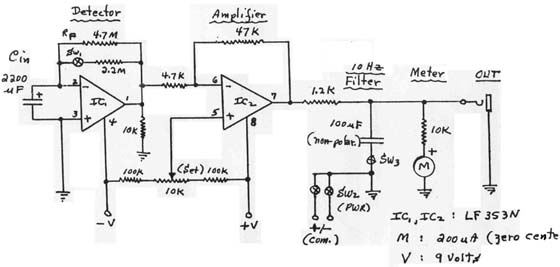 (2) Meter as obove reads impulses; place 470 uF to 21,000 uF capacitor (or higher!) across input for use as g-field gravimeter;
