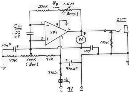 The circuit is a standard GW detector unit designed around the readily available 741 operational amplifier (op-amp) device. This unit is more fully described in the article "Gravimeters: A New Window to the Universe?" Circuit parameters and controls were adjusted for this particular application to provide for both the gravimeter and GW signal modes of operation with very simple circuitry. This circuitry is shown in Figure (1).