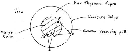 The nature of quasar response can be depicted with the rhysmoid model of the universe as shown in Figure (2). The earth’s position in the matte portion of the universe is shown at point E, while a Seyfert galaxy is shown at point S1. The Seyfert galaxy can be viewed directly, in a shorter distance E-S1, but viewing is through the matter universe with its dust clouds and galaxies as well as interstellar gases and molecules, all of which lead to absorption of EM wave energy; thus, at best, galaxy S1 is very dimly seen, if at all. However, galaxy S1 can also be viewed over a much longer path, E-2-S1, reflected off the edge of the universe at point 2, but with differences. Absorption bands are present only in the matter regions near earth and the Seyfert galaxy regions. However, most of the EM wave propagation takes place in the pure rhysmoid regions, which has no absorption bands, not even for interstellar hydrogen! However, due to the much longer propagation path, the spectral lines from galaxy S1 will be highly redshifted (we will actually be seeing the very short wavelengths being generated in this active nucleus region) but with little or no absorption of this radiant energy. Thus, even though the transmission path is very long, the galaxy will look bright, especially the nucleous region. Since we are observing a small nucleus region, fluctuations will be present due to the small volume of the source of this radiation. Rhysmonic cosmology therefore predicts: