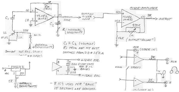 (1) 8 ICs are used per 'bank'; 15 sections are sensors (2 diatonic octaves); 1 section is mixer-amplifier;