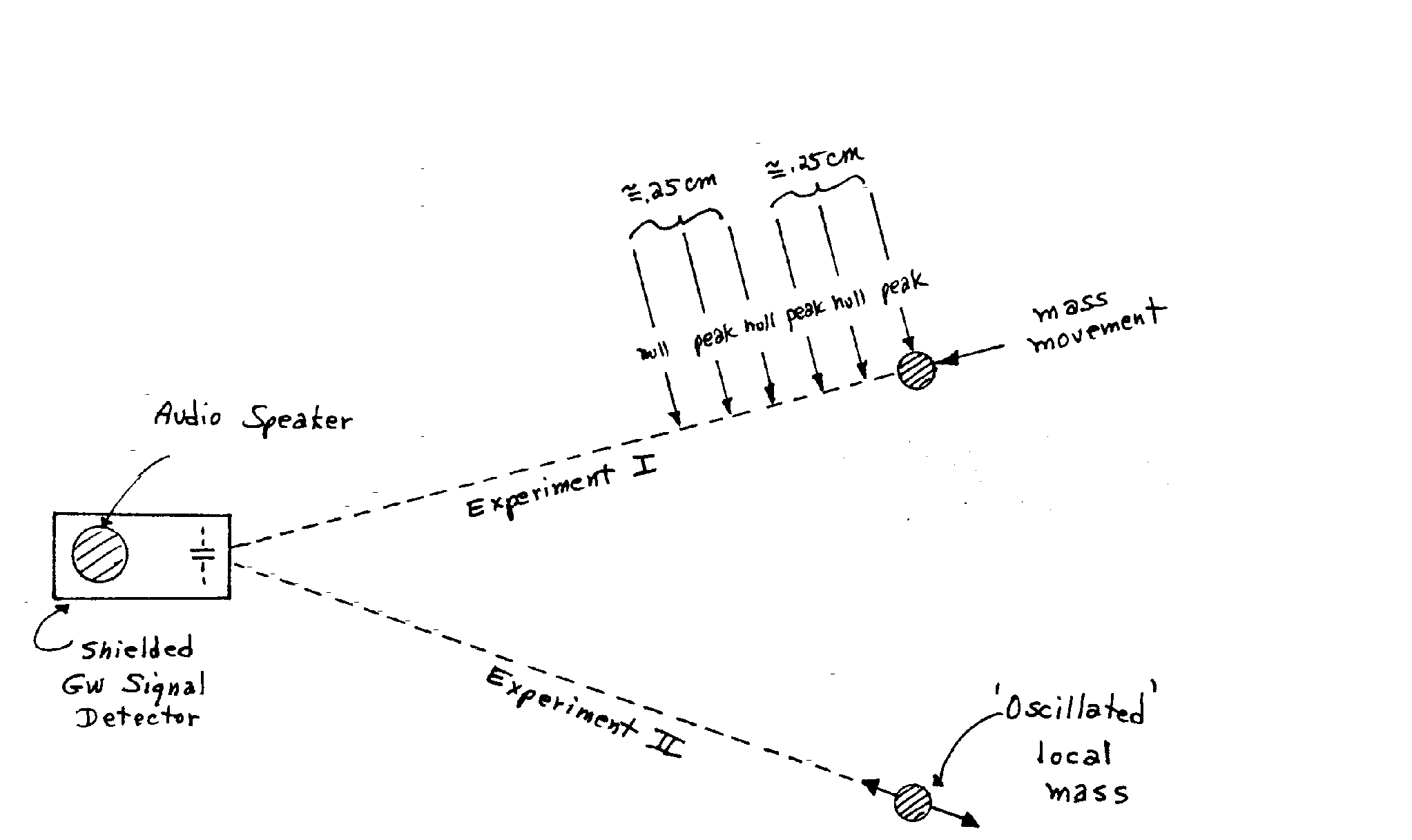 Figure 14: Local "modulations" of the gravitational signal background levels. Experiment I: Demonstrates the existence of a 0.25 cm long "standing wave" in the overall gravitational signals which are summed up or integrated in our black body universe. Experiment II: Demonstrates the initiation of a universe-wide gravitational disturbance by a mass movement at the local level