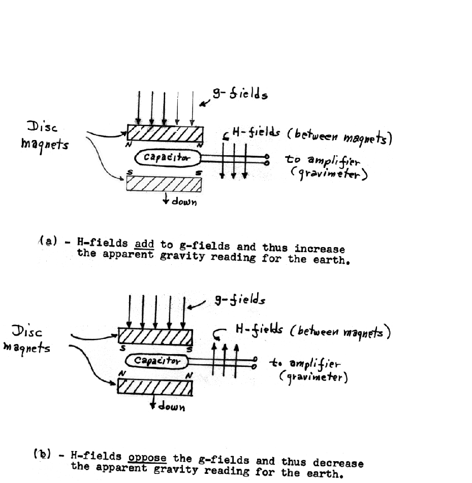 In Figure (16a), a relatively uniform magnetic field, e.g., a small segment of a closed magnetic loop as supplied by two disc-type ceramic magnets "sandwiching" the detecting capacitor, are oriented so that the directed rhysmonic vectors of the magnetic field are in the same direction as the directed rhysmonic vectors of the earth’s gravity field, or g-field. The fields, being the same entities and in the same direction, sum up. Thus the magnetic flux increases the apparent strength of the gravity field, i.e., the earth appears to be more massive. When the magnetic field is reversed, as in Figure (16b), the rhysmonic vectors are in opposition and thus reduced, making the earth now appear to be less massive. The fields are the same entities, and thus a uniform magnetic field (parallel field) is indistinguishable from the gravitational field in this case.