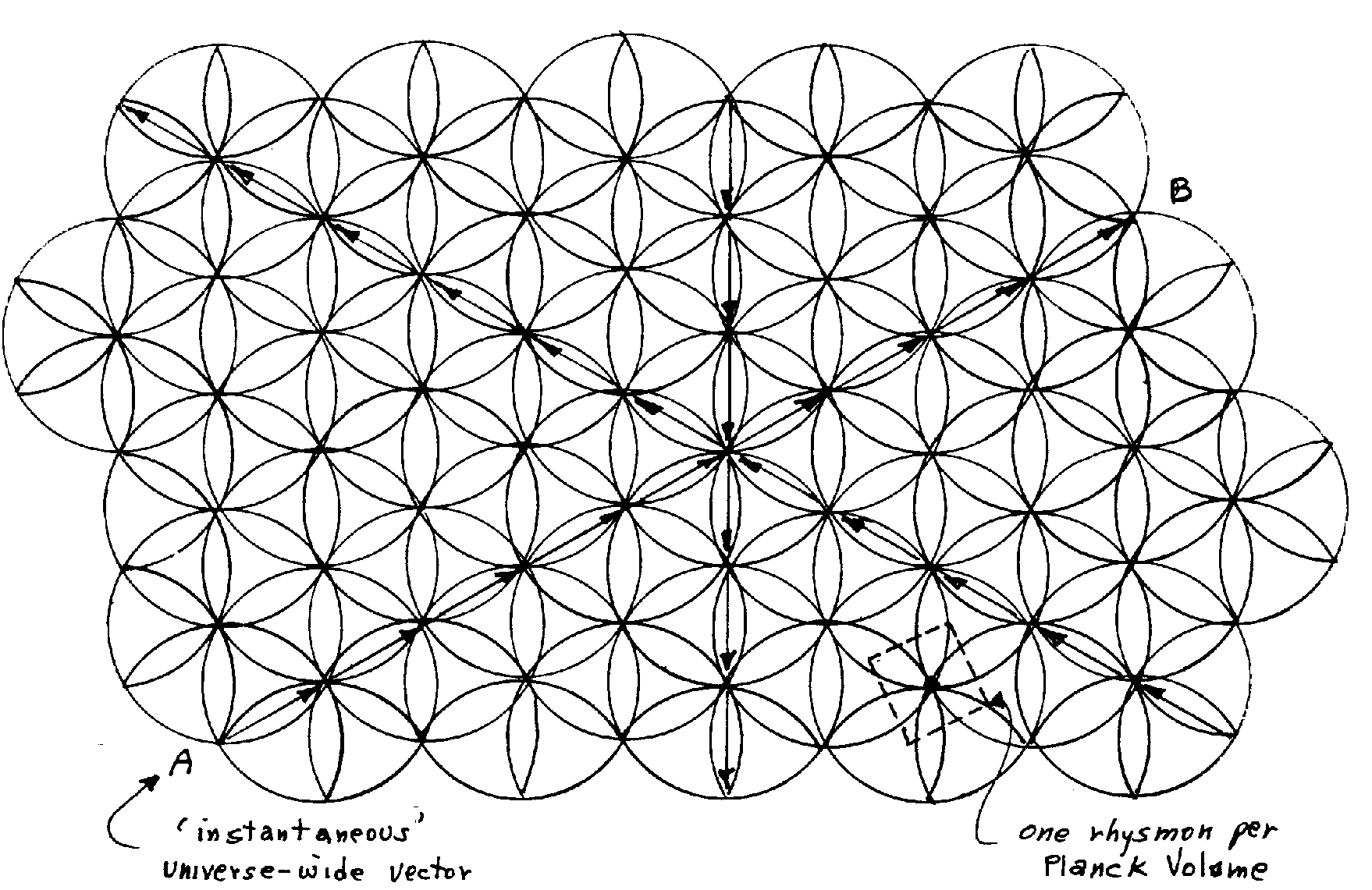 Shown in Figure 1 is a planar view of a portion of the vector equilibrium basic cell of the matrix structure in free space, i.e, the vacuum, from which one can define some basic constants in this structure. This basic view directly defines the quantum unit of action for the rhysmon (which is the Planck Constant) and other fundamental units of length, time, and velocity (which are also the Planck Natural units of measurement) (Ref. 2).