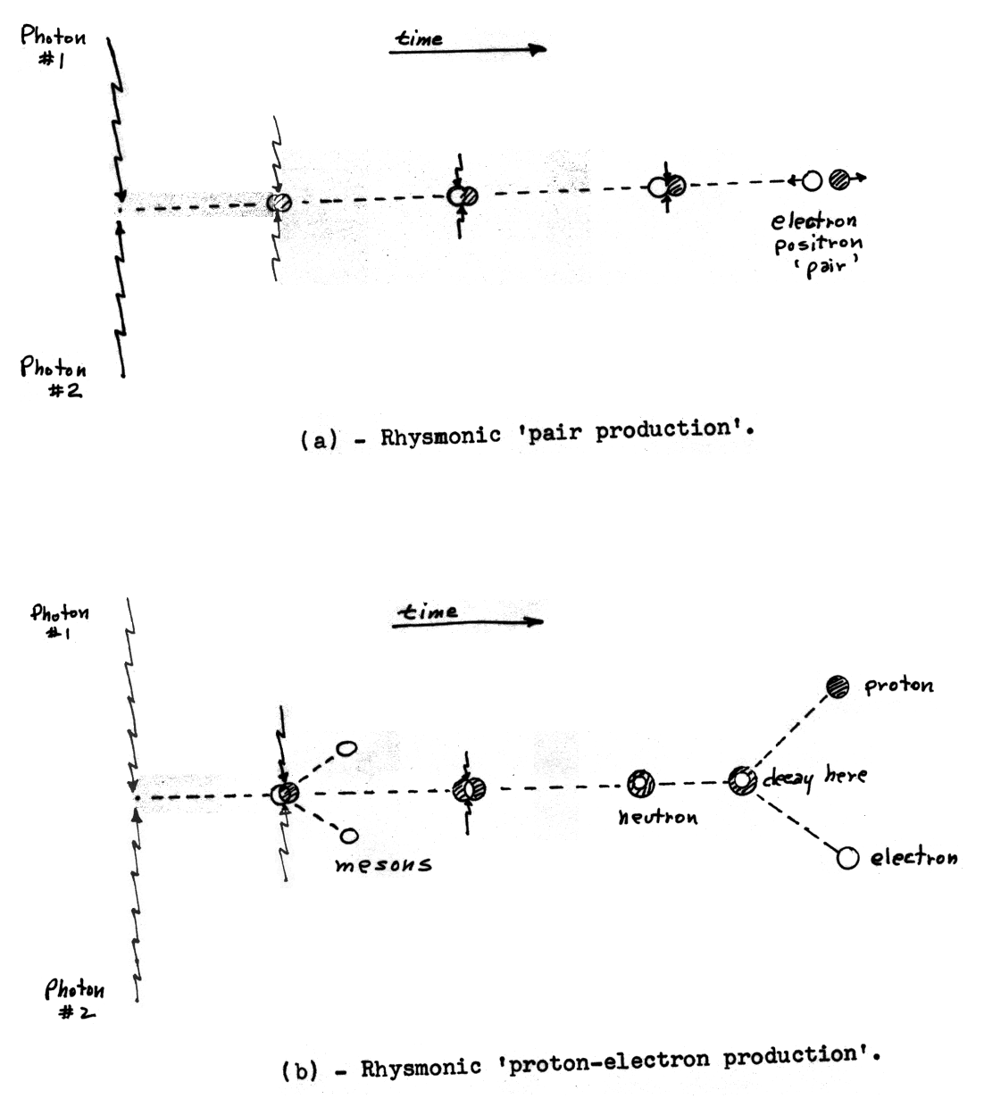 hquantum of action. In a pure rhysmoid, these energy vectors cancel and no phenomena exists. Any modification or disturbance in this structure results in phenomena known as particles or fields.Rhysmonic Particles: These are localized structures in the rhysmos where there are excesses or deficiencies of rhysmons in the matrix structure as compared to that of the pure rhysmoid. The geometry of these structures could be very stable, forming the known masses of the universe, or transitory, forming the many short-lived splinter particles of physics.