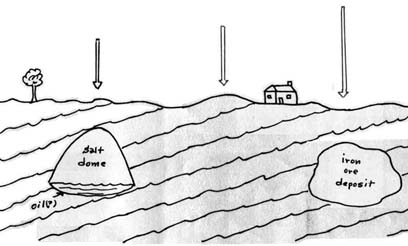 It can be seen from the above equations that weight on earth is dependent on the earth mass, M, the earth radius, R, and the gravitational constant, G. The earth mass may be assumed constant and if the gravitational constant is assumed constant, then the earth radius is the only variable. Its value depends upon one’s latitude position and height with respect to the surface of the earth. The radius of the earth is about 15 miles less at the poles than at the equator. In addition, centrifugal forces due to the earth’s rotation can reduce the ‘pull’ of gravity, being greatest at the equator and zero at the poles. Therefore, when consideration is taken of these factors, a ton weight (2000 lbs) that is first measured at sea-level at the north pole will be found to weigh about 7 lbs less at sea-level at the equator. Also, for example, the value of g at Paris, France, is about 32.184 ft/sec2, while the value of g at New Orleans USA would be about 32.129 ft/sec2, or about 0.17% less. While the overall mass of the earth is assumed to be constant, there may be localized variations in earth density which can and do affect the value of g locally and thus the weight. For example, the presence of a salt dome (which can signify oil deposits) may reduce the value of g above such a deposit, while ‘heavy ore’ deposits may significantly increase the value of g as depicted in Figure (2). Also, it will be shown later that the gravitational constant, G, may not really be constant in that it can be affected by certain ‘cosmological events’, both as very short term effects as well as somewhat longer term effects. Thus the accelerating factor, g, may vary at any particular location, and such variations may actually be measurable with devices which can be termed gravity meters or gravimeters.