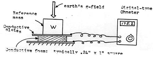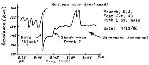 A more practical mechanical gravimeter for the amateur scientist is shown in simplest form in Figure (4b). This is a typical spring balance system, but the ‘spring’ of this system is a conductive compressible foam material, such as that which is used to safely ship very static-sensitive integrated circuits. Here, any variations in weight will appear as variation in compression of the foam and thus as variations in the resistivity of the material. The resistance can be directly measured with an ohmmeter, preferably one of the digital type. That such a device is a viable gravimeter for the amateur scientist is seen in Figure (4c) where the response of the unit to what may have been a super-nova type event in the celestial sphere was recorded. More on this later. The experimenter may wish to try different sizes of foam as well as reference weights for different sensitivity to gravity events. The amateur scientist is also cautioned to remain within the elastic limits of the foam material.