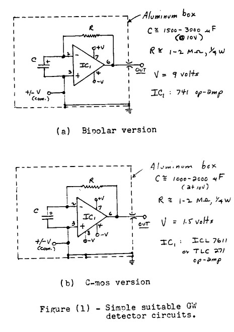 The experimenter is cautioned here that while the basic design of these detectors is very simple, components and devices do vary. The experimenter may wish to try several electrolytic capacitors or op-amp devices if difficulty is seen in achieving the effect given here. Especially the bipolar op-amp devices, even if they are labeled the same, may be quite different in structure and performance; some might even have different pin-outs. The author has constructed many detector units (and many colleagues also have done so) so that he has confidence that the careful and patient researcher, amateur and professional, will be able to duplicate these results.
