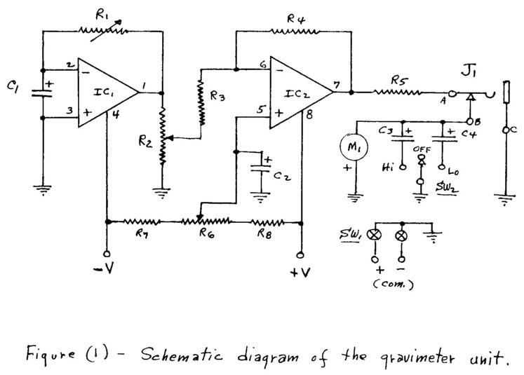 In the C-MOS version, Newtonian gravitational force field gradients interact with the electron-ion structure of the dielectric in the 1000 uF input capacitor C1, to generate small current fluctuations from that capacitor and these fluctuations will reflect the gravity gradients being intercepts by that capacitor. Section IC1 of the op-amp is operated in the current-to-voltage conversion mode and the small input current fluctuations from capacitor C1 are converted to much higher voltage fluctuations. The sensitivity of this stage is controllable by the high resistance feedback resistor, R1. Output from the detector section IC1 is then coupled out through a gain control potentiometer, R2, to drive a conventional inverting amplifier, IC2, which has about a x20 voltage gain. An offset control, R6, in the non-inverting input of IC2 is used to establish the operating position of the averaged gravity-induced output levels on the analog display meter, M1. the display meter is a 100 uA meter operated as a 0-1 volt voltmeter in conjunction with the series resistor, R5. Capacitors C3 and C4 form part of a low-pass filter network (utilizing R5 also) to establish a time constant for integration of the meter response to the gravity fluctuation signals. A very long time constant, i.e., a very low cut-off frequency for the LP filter, is used to largely measure the averaged gravity levels, while the shorter time constants are used to monitor the more rapidly varying responses of the ore distant astronomical events. The switch SW2 provides for three levels of integration. A DPST switch, SW1, is used to interrupt the common return leads of the dual power supply used separately while in the off position. This is necessary to avoid the small battery drain that would occur is a SPST switch were used here. The output jack, J1, provides for an output to any external device such as an external meter, an audio amplifier, a strip chart recorder, or a computer unit, if desired. To avoid possible RFI problems, the unit should be fabricated in a Faraday type shielded enclosure. A simple aluminum box enclosure containing the entire circuitry, including the battery supply, should be adequate for most observing locations.