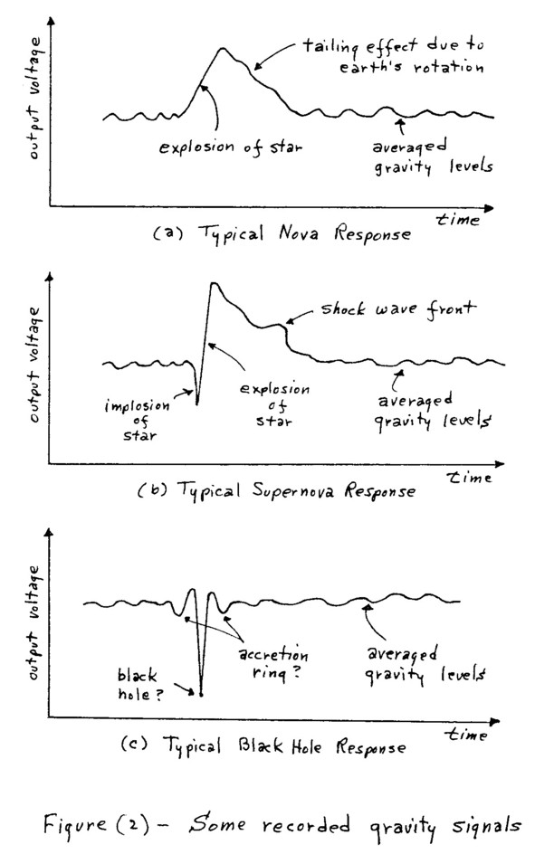 Many of the active astronomical events detectable with these units appear to be nova and supernovae. Novae are believed to be stars which lose much of their outer layers in a nuclear-type explosion. These events are detectable (and quite often) since the rapid expansion of the star’s outer mass causes a Newtonian force field gradient, which, if it happens to lie on the detector’s meridian position, causes a superposition of fields on the earth’s gravity field, and thus results in a measurable change in the earth’s gravity field. Supernovae are believed to be large stars which implode to a neutron star or black hole type of structure, and then blasts of much of their volume and atmosphere. The response as detected by these units shows both the implosion and the explosion of the event. After a massive supernova event, the neutron star or black hole type of structure, i.e., a very small very dense mass, is generally seen at that location, often accompanied by what the astrophysicists have termed an accretion ring. The units also detect what appear to be very dense masses but without an accretion ring. These may be very old black holes which have since lost their accretion rings.