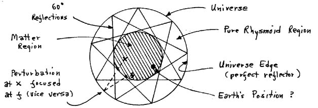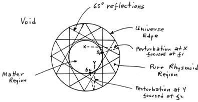 It was indicated in Figure (2) that matter (mass) particles form only out to the half radius point in the rhysmoid universe. This is primarily due to two factors as depicted in Figure (3). First, due to the rhysmoid’s hexagonal geometry, ideal 60o reflections from the edge of the universe will be limited to the outer one-half radius, and thus this region will tend to remain a pure rhysmoid. Second, any perturbations within the center half of the rhysmoid sphere will reflect off the spherical edge of the universe to the focal plane which is also the edge of the center matter sphere, thus maintaining the outer half radius as pure rhysmoid. By the same token, perturbations at the focal plane can be reflected off the universe edge and possibly be statistically combined at different points in the matter region, creating the excesses and deficiencies of rhysmons which make up the matter in this region. While this matter in the central region is created randomly, the matter would probably be organized in some fashion by gravitational effects which would appear with the creation of this mass or mater. It is also feasible that possible collisions between multiple universes (possible in rhysmonic cosmology) may also create mater in this region by shock action.