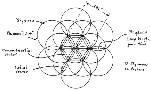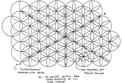 The substratum, or the new arther of the vacuum, is a storehouse of potential energy provided by the extremely small spherical objects called the rhysmons. The rhysmons are contained within individual ‘orbits’ and have energy equal to one Planck Constant quantum of action, h. Individual rhysmons intertwine with other rhysmons in a matrix structure as shown in Figure (1). In this planar view it is seen that interweaving results in short directed rhysmonic vectors which now have energies of h/2 pi, or h quantum of action. From this construction, one can define some additional parameters based upon Planck’s Constant and his system of natural Units (Ref 3). These are given in Appendix I for reference. The complete matrix is shown in 3-dimensional form in Figure (2). This basic cell is reminiscent of R. Buckminster Fuller’s vector equilibrium (Ref 4) in that all directed energy vectors in the pure rhysmoid, i.e., the undisturbed vacuum, cancel their energies and thus display no effects or phenomena which can be ‘observable’. The basic cell structures interlock with other cells to form the vacuum of the universe. This interlocking is depicted for an extended planar view in Figure (3). Maximum use of energy content requires that the 3-dimensional universe be in spherical form. Shown in Figure (3) are the directed energy vectors as given in a single instant of time as given by the Planck Time, T*. In the next instant of time, T*, all the vectors reverse direction, and then restore to the original direction in time, T*, later. Thus the universe is like a movie, in which each frame in the cinema of existence lasts for only Planck Time, T*. As seen in Figure (3), directed vectors join head-to-tail to form an ‘instantaneous’ vector which can span the universe. The instantaneous vectors are especially significant in the rhysmonic explanation of the nature of gravitation. However, the interaction of these vectors in the process of EM wave propagation must be discussed briefly here as they are essential to a discussion of the redshift mechanism. This simple interpretation of the structure of the universe forms the basis of rhysmonics.