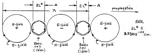 As is shown in the planar view of the circumferential vectors of the basic cell of the matrix structure of Figure (1), the closest approach of any two adjacent parallel directed vectors is approximately two time the Planck Length, or 2L*, which is equal to about 3.2 x 10-33 cm. Since the magnetic component in electromagnetic wave propagation is at right angles to the direction of the propagation and since curl or a rotational vector geometry is involved, magnetic field reversal cannot take place closer than this closest approach of parallel vectors, or 2L*. It can be shown that a similar requirement is needed for the electric field (curl) vectors (see References). Therefore, for each magnetic field (or electric field reversal), i.e., for each half wavelength of electromagnetic wave propagation, the wavelength must increase by this increment of 2L*, or 4L* for the entire wavelength.