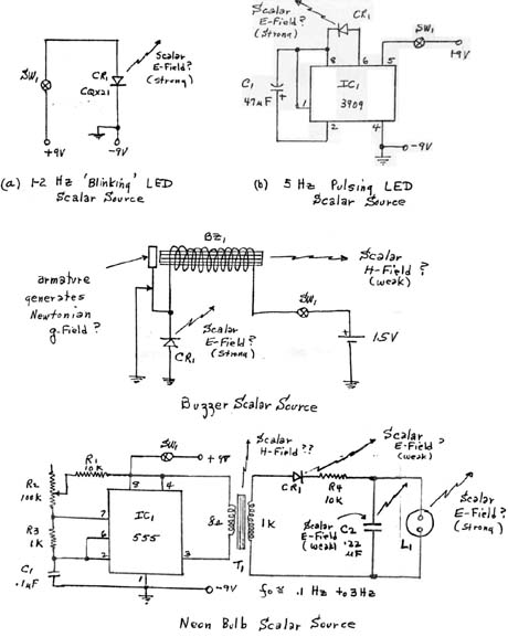Local weak scalar signals of the ‘pure’ electric type or the ‘curl-free’ magnetic type may be generated with the circuits shown in Figure (3). These signals have been detected at about 75 feet, the maximum lab distance available. However, they are at about the same level as the background radiation and thus are somewhat difficult to ascertain within the general background responses. The use of different pulse rates for these generators helps to properly identify the correct scalar signal. In general, low pulse rates must be used with these signals.
