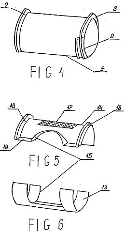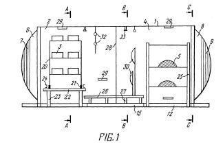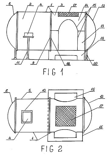 [0009] Each reflector 6,8 is secured by its end side to mounting frame 10 (FIG.4, 5) by means of eyes 11. Said frame has a support system comprising plate 12, mounted on a foundation, and inclined columns 13. Each reflector 6, 8 at its edges has flanges to which are secured rods 14 which encompass cylindrical housing 1 to ensure its rigidity. Housing 1 has a support made in the form of bed 15. In housing 1 for compartments 2 and 4 are provided doors 16, 17 (FIG.2, 3) being a part of the surface of housing 1 and having for the cylindrical design of ) housing 1 a form of an arc. In spherical or elliptic designs of said chambers doors 16, 17 have the forms of a part of a sphere and a part of an ellipsoid respectively. Doors 16 and 17 are secured to columns 18, 19 by means of hinged joints (FIG. 2, 3). In compartment 2 in the zone of focus of the first antenna system is provided means for placing source 3 of biofield; such means may be designed in the form of movable shelf 20 (FIG.1, 2, 6, 7) having wheels 21. Shelf 20 is mounted on support platform 22 located opposite door 16. Platform 22 is secured on columns 23 passing through slots in housing 1 and is supported on said foundation. Platform 22 has side guides 24 (FIG.1, 2) for wheels 21 of shelf 20. Behind this assembly is installed a limiter of shelf movement (not illustrated,l. In compartment 4 in the zone of focus of the second antenna system is provided a means for placing of one or more biological objects 5; said means is made in the form of multiplier or single-tier bed 25 (FIG.1,6,7) supporting elements of which through said slots in housing 1 are mounted on said foundation. Housing 1 has floor 26 for people to move around. Supports 27 for said floor are located in such a way
