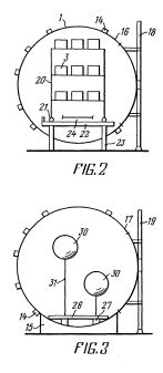 [0010] that they through cylindrical housing 1 are supported on bed 15. Compartments 2 and 4 may be separated by means of partition 28 (FIG.l) secured in housing 1 and made of the material that. can be-penetrated by the bioelectromagnetic field, for example, of polyethylene (or coloured polyethylene) or foam plastic. Housing 1 has several apertures 29 (FIG.1) covered with a small mesh brass lattice (mesh size: up to 1 mm) for communication with the environment. Near said means for placing a biological object ) at the side opposite to the second antenna system is mounted a group of microwave lenses 30 (FIG.l, 6, 7) the number of which corresponds to the number of tiers of bed 25 used for placing bioobjects. Support 31 of lens system 30 is located on floor 26. It is possible to provide a regulated movement of said lenses horizontally and vertically. Total area of all said lenses must not exceed 10% of the cross-sectional area of housing 1. In housing 1 are installed conventional lamps 32 and quartz lamps 33. The second antenna system may be supplemented additionally with convex metal mirror 34 (FIG.8) located in the zone of reflector 8 and lens 9 and facing by its convex side said reflector to ensure the concentra- tion of the electromagnetic radiation of biofield into a narrow beam. It is recommended to use it in case of influence on a small biological object. The operation of said device for transmitting a natural information supply to a biological object shall be performed in the following way. Through door 17 biological objects, for example, several people, enter compartment 4 and are placed on tiers of bed 25 while through door 16 to compartment 2 is delivered movable shelf 20 on the shelves of which are placed sources 3 of biofields. In the capacity of