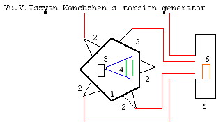 ...The fifth type of torsion generator employs a combination of the principles described above. For instance, a combination of high-frequency electromagnetic oscillations and topological effect (shape effect) is used in the generators developed by Yu.V.Tszyan Kanchzhen. (The operation of his devices was interpreted as "high-frequency bio-communication".) Fig.5 shows the diagram of Tszyan Kanchzhen's torsion generator. The object 6 (e.g. a hen) is placed into the receiver-enclosure 5. Another object 4 (e.g. a duck) is placed into the transmitter-enclosure. The transmitter-enclosure is a three-dimensional shape consisting of pentagon 1. Cones 2 are placed on the sides of these pentagons. The object 4 is subjected to the influence of a generator of high-frequency (~ 11 GHz) electromagnetic oscillations 3. The torsion component of these EM ocsillations excites the torsion field of object 4. This torsion field is also intensified by the topological effect of 1,2. The excited torsion field is concentrated at the tops of the cones 2 and then is directed to the receiver-enclosure 5. As a rule, a several-day stay of objects 4 and 6 in them resulted in following. If a hen is placed in the receiver-enclosure and a duck is placed in the transmitter-enclosure, then a hen gradually starts to look like a duck. (For instance, a hen gained duck webs and etc.)