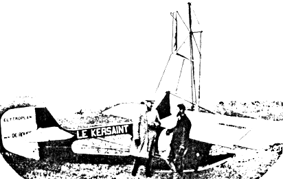 Below, Vicomte de Rouge, a French engineer and inventor, seated in his strange tailless plane. Opening the hexagonal control on the mast directs the plane upward and closing it guides it down. The rudders on the wing tips are used to steer the queer craft.