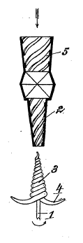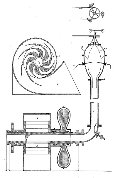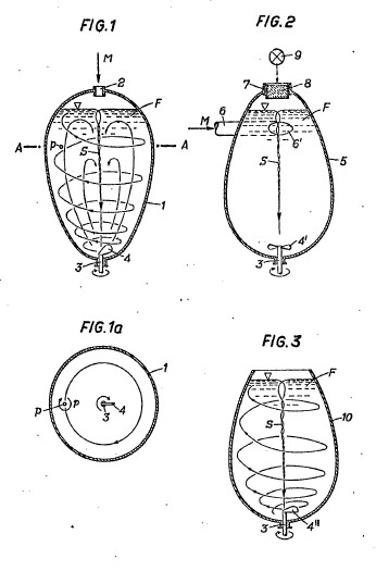 2. Is a diminutive, but faithful copy of the Earth itself, within which an agitator rotates, which is attached to the end of the vertical shaft. In addition, the Klimator consists of a series of nested, rilled, calyx-like ( 4 -- Calyx = the sepals of a flower collectively forming the outer floral envelope, protective of the bud. -Ed.) vanes, which are so constructed that the through-flowing masses, such as water and air, can be bio-centrifugated. Through the increase in centripetating and centrifugating velocities, which have hitherto never been achieved anywhere, increases in pressure and suction are produced, which reciprocally amplify each other exponentially. This results in the decomposition of the water and air due to the thorough trituration of the smallest molecules of sediment, leading to the development of a hitherto unknown process of synthesis. This gives rise to two longitudinally oriented types of inward flowing, spiral-like currents, one flowing upwards and the other downwards.
