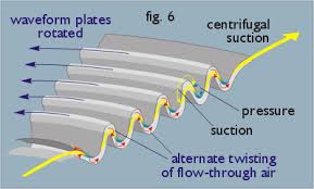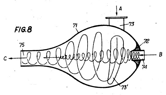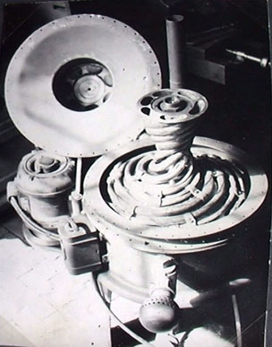 To restate the process briefly: axial->radial expulsion results in explosion,decay and combustion. Impulsion, or a radial->axial impetus results in implosion, ennoblement and autonomous upward displacement (levitation). In this case reactive suctional forces operate first during the ascent and are then reinforced by supplementary reactive forces. This is how physical weight is overcome naturalesquely, during which process the already higher-grade energetic ballasting elements are precipitated out and manifest themselves as falling and concentrating heat-forms. If this formative process is copied naturalesquely in a so-called Klimator (see figs. 27 and 28), which is suspended from the ceiling and moved bio-centrifugally then a falling and concentrating heat-form is produced with which the living space can be naturalesquely heated in winter. If these invigorative cold-forms with their rising and expanding properties are introduced into an evacuated glass bulb, then the energy-concentrates,which in any case move exceptionally rapidly, exceed their highest velocity in this resistance-less space. In the process they eject high-grade ballast material which interacts with the residual oxygen still present in an extremely rarefied state. The product of this renewed union is atmospheric space-light, naturalesquely copied sunlight as it were. This evolves and lights up the vacuum bulb when the bulb, which has no other connections apart from the earth-wire, is merely earthed. All that is required therefore is to connect the earth-wire in order to make the living space as bright as day. To extinguish this natural light, which is of course temperatureless, the earth-wire is simply disconnected. If virtually free mechanical power is required, then the above higher-grade heating effects merely need to be switched off, thus converting them into formative and levitative invigorative forms (cold-forms). This immediately reactivates the ur -- powerfully-waxing buoyant motion, which here should been visaged as a bio-magnetic up-current (a synthesizing current). With elemental force arising from an energy gradient that evolves along a common developmental axis, this up-current sucks up the generating device in its wake, i.e. it effortlessly overcomes its own weight. Aircraft, submarines orheavy projectiles can be propelled like lightning in this way at negligible cost.In stationary machines on the other hand, which must be well anchored to the ground, the indrawn air will be almost instantaneously decomposed, trans-formed and built up as described earlier by passing through a curviform pipe.The concurrently coincident water, i.e. the discharged and inwardly collapsed medium, will be expelled at the same time, resulting in the ur-generation of a high-grade high-quality space -- the organic vacuum. This is the opposite of atmospheric air pressure and is the best and cheapest attractional force to be found anywhere on this planet. It is also the space that produces ray-like forms which penetrate through al l enclosures and stream upwards.