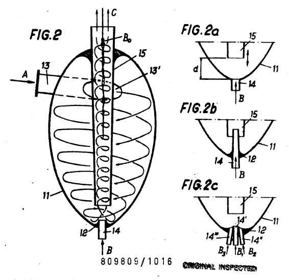 DE1040730 -- Device for treating liquids and gases comprises funnel having part directed from funnel opening formed as mold sleeve body with section of hyperboloid