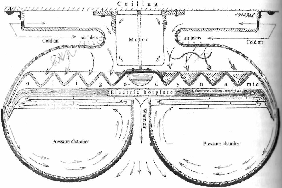 The primary product of synthesis, a biomagnetic formative and levitative current, will not be elaborated in more detail here, since we are primarily interested in the solution of the problem of heating, namely, with the function of the secondary or reflux current. This is a potential with which it is possible to heat up a space from the ceiling downwards, like the Sun does. It is a radiant form of heat, which heats the whole space evenly. If the intensity of the small heating resistance (element) is reduced, however, for which the rate of rotation of the agitator must be increased, then the living space is suffused with an evenly dispersed, rising, expanding and high-altitude-like fresh air. In this way the natural, reactive forms of temperature are produced nearly free of cost, through which the natural warmth of the valley-climate comes into being. It is a mountain micro-climate. The Klimator represents the most basic developmental form in which the natural, primary motive forces can evolve, whose two components are to be differentiated as: