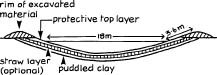 The builder of a clay-puddled pond first made a concave excavation, sloping the sides carefully at an angle of not more than 40 to 45 degrees. He then lined the concavity with a 6- to 8-inch layer of the coarsest straw he could find. On top of the straw he put a 6-inch layer of clay, which he moistened and tamped down into the straw as tightly as possible.